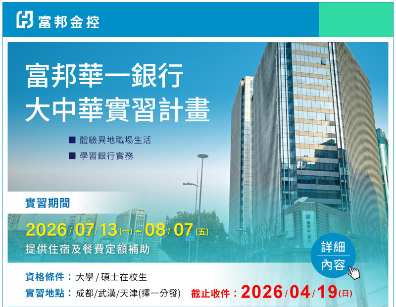 2026年富邦華一銀行暑期實習計劃已正式開放申請,提供住宿及餐費定額補助,本計劃履歷收件至4/19(五)截止,歡迎 貴校系同學踴躍參加甄選。