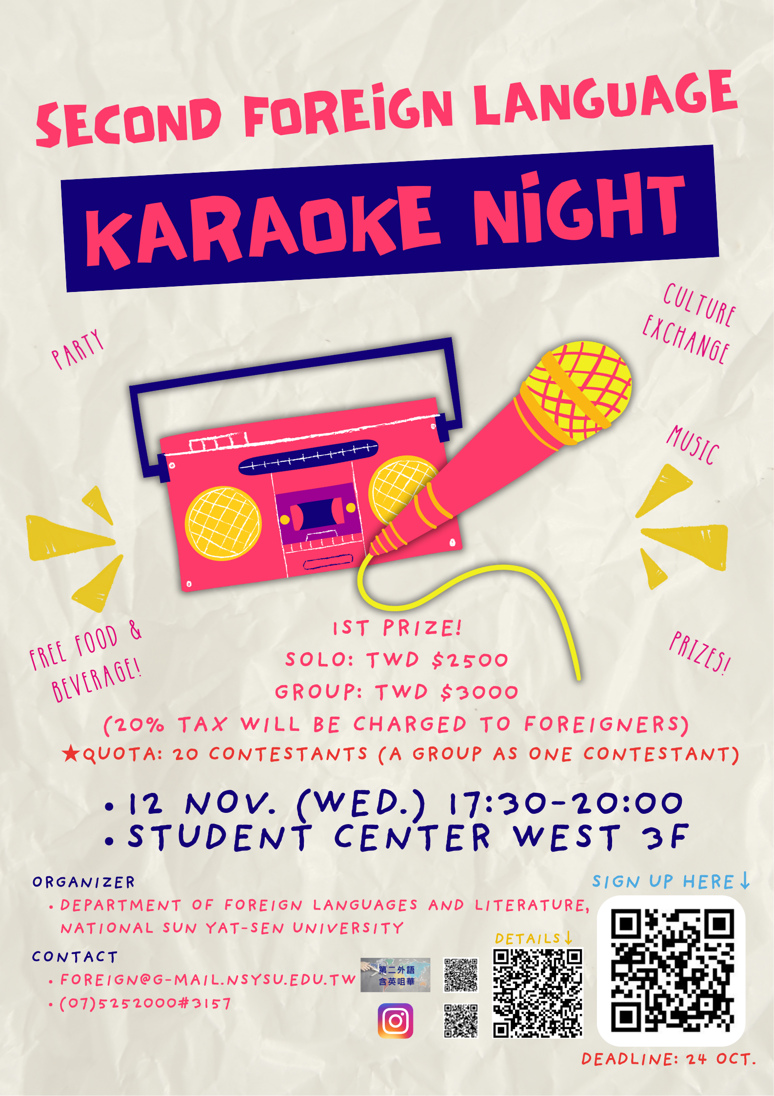 外文系即將再度舉辦年度盛事!我們將於11月12日,週三下午5點半至8點,於活動中心西三樓—多用途大廳舉辦第二屆-「第二外語卡拉OK夜」,歡迎喜歡歌唱表演的同學們加入同樂!我們鼓勵同學以中英文以外的外語演唱你喜愛的歌曲,可選擇報名獨唱或對(合)唱組,最高獎金獨唱第一名為2500元,合唱第一名為3000元,還有精美獎品等你來拿!現場也備有精緻點心讓大家享用,歡迎對自己歌喉有自信的同學來一展歌喉!