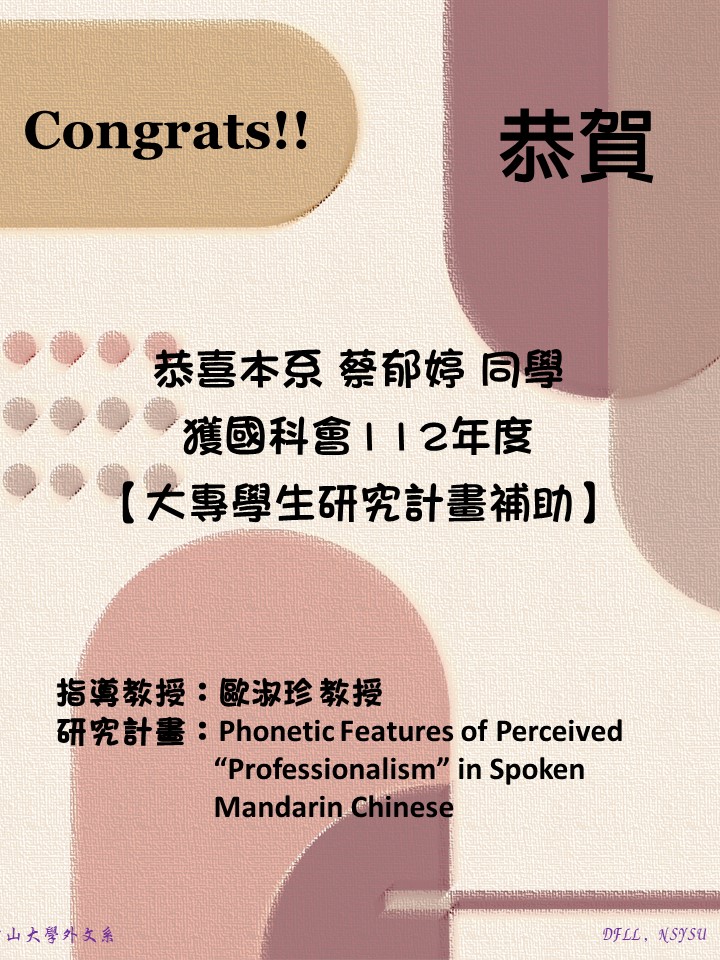 恭賀本系 蔡郁婷同學 榮獲「國科會112年度大專學生研究計畫補助」