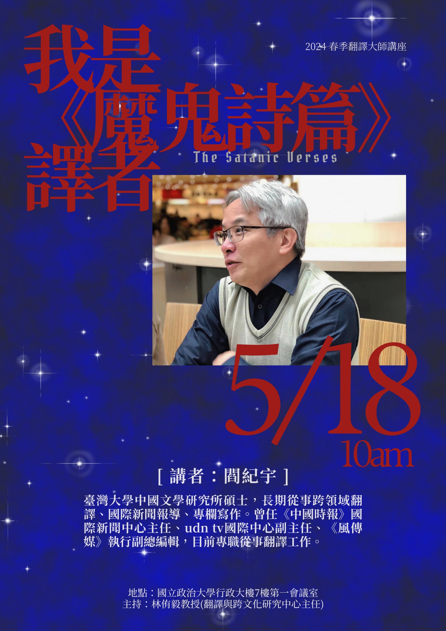 112學年度第二學期的第二場翻譯大師講座邀請曾任多家知名媒體新聞部主任及編輯的閻紀宇先生蒞校演講。閻先生畢業於國立臺灣大學中國文學研究所,長期從事跨領域翻譯與國際新聞報導、評論工作,翻譯作品涵蓋政治、經濟、哲學、歷史等領域,更曾於2022年翻譯出版爭議極大的魯西迪小說《魔鬼詩篇》。本次演講閻先生將無私分享從事翻譯工作的心得與經驗,歡迎踴躍報名,實體與線上同步舉行。